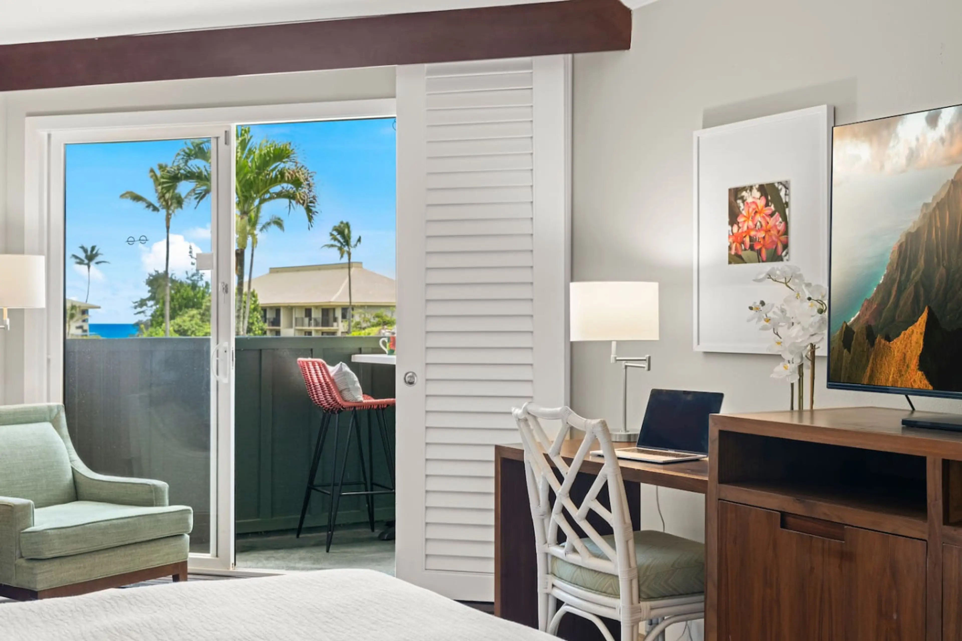 Relax and replenish at this lovely and clean hotel room at the sought-after Outrigger Kauai Beach Resort. Situated with amazing views of the pools, ocean, and tropical paradise of the unmatched landscape . See the sunrise from your private lanai over the Pacific while enjoying the clean and easy l...
